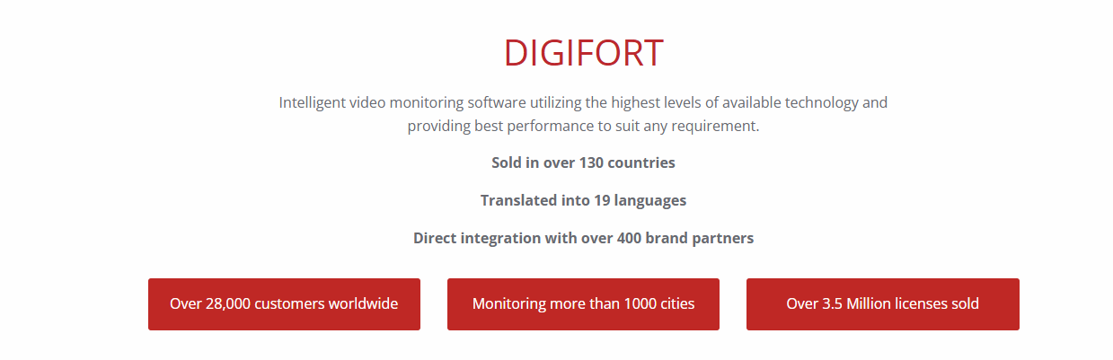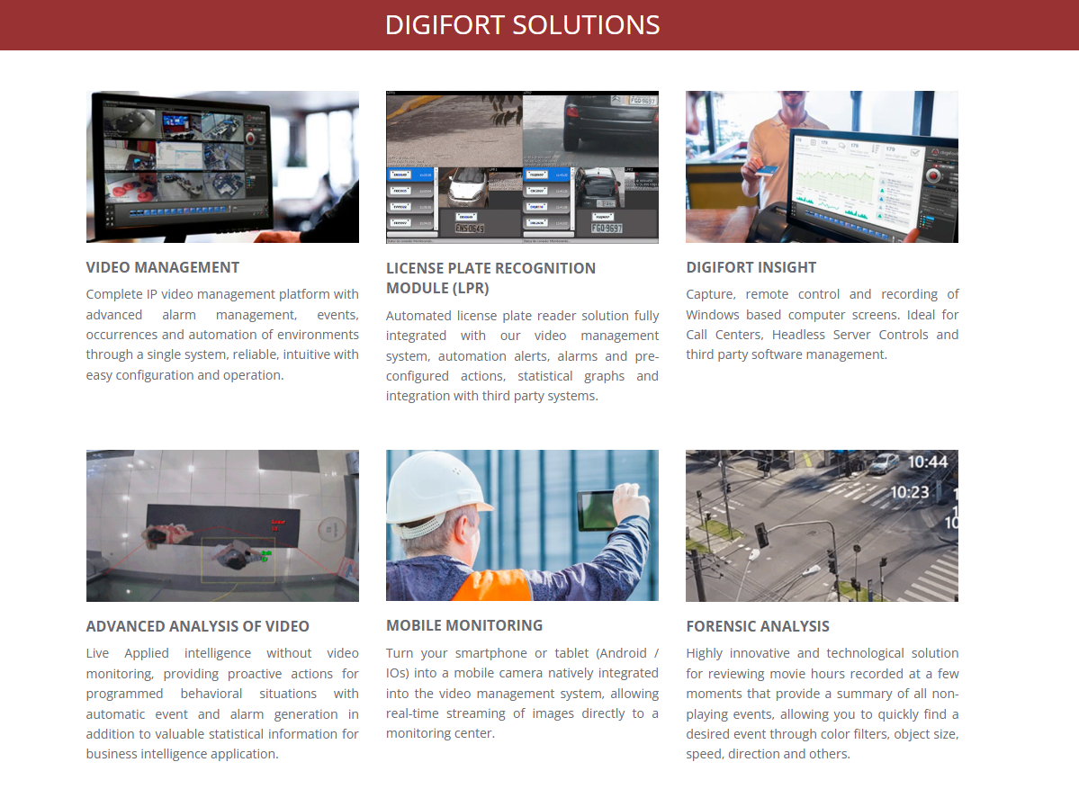 Digifort-producten zijn zorgvuldig ontworpen om videobewaking en -beheersoftware van de hoogste kwaliteit te bieden, die de marktnormen en -verwachtingen overtreft en tegelijkertijd op maat gemaakte functies biedt voor een breed scala aan toepassingen. Tegenwoordig heeft het meer dan 240 fabrikanten wereldwijd en meer dan 6500 modellen apparaten geïntegreerd in het systeem, compleet alarmsysteem en automatisering, het lezen van kentekenplaten, intelligente module voor beeldanalyse, integratie met elk toegangscontrolesysteem, biometrie, CRM, ERP, stadsbeheersoftware, en meer.